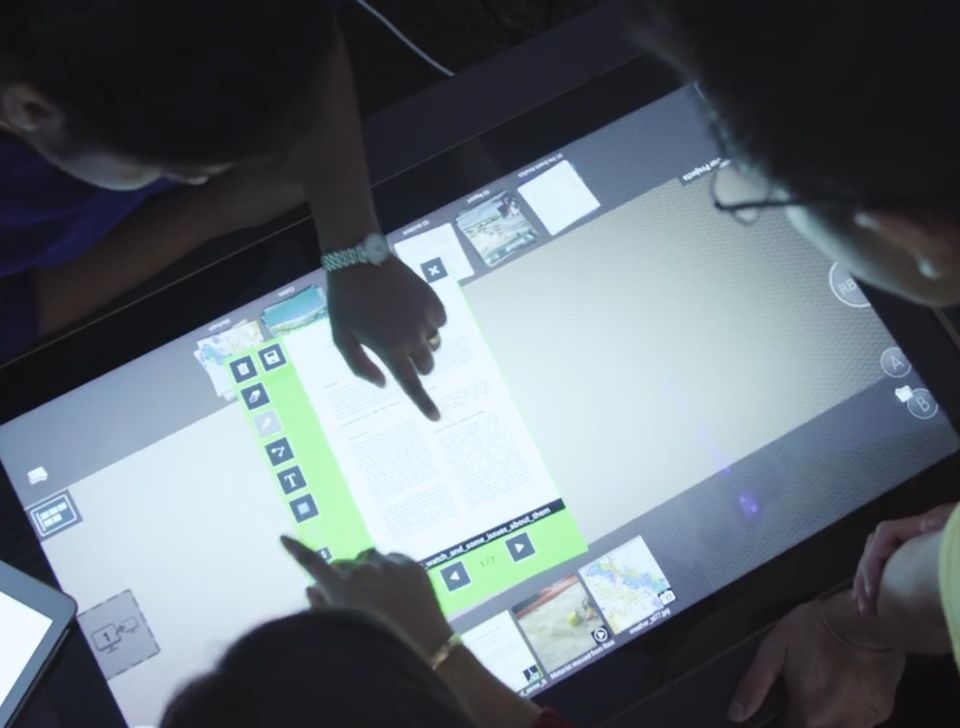 Comprised of a large multi-user & multi touch table device with a secondary display screen and connection hub.